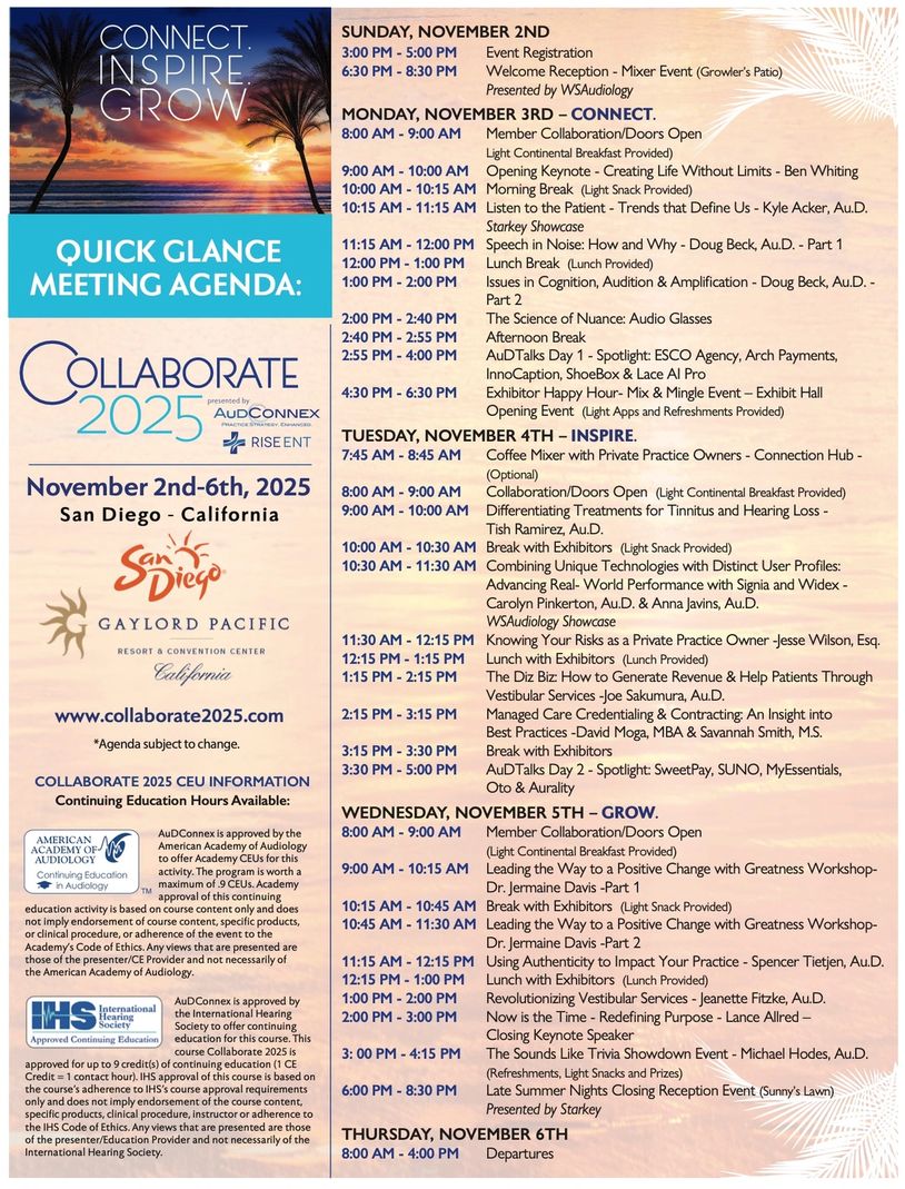 For more information on Collaborate 2025 presented by AuDConnex/RiseENT, call 888-571-5107 or email info@audconnex.com / manager@audconnex.com.